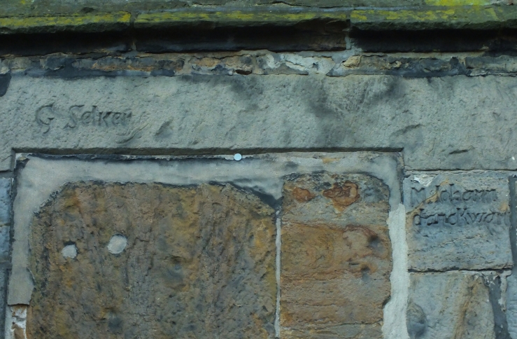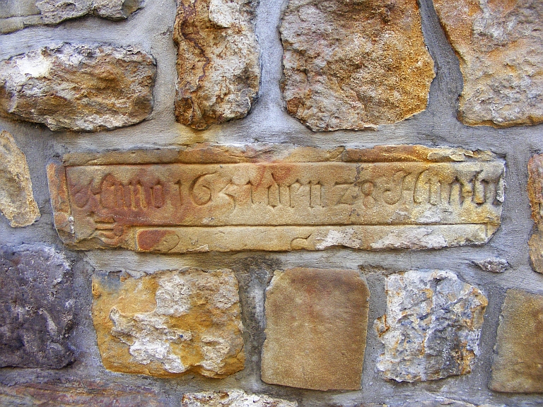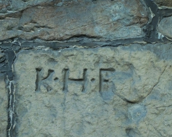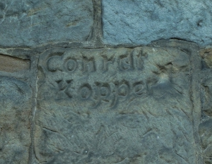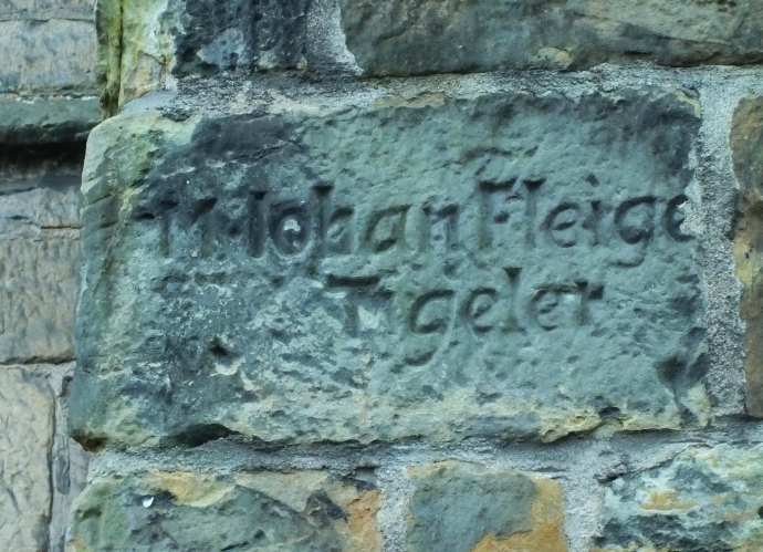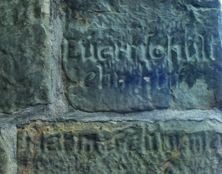 Wer genauer hinschaut, kann an der Kirche in den Sandstein gemeisselte Namen erkennen. Es wird sich wohl um die Namen von Arbeitern handeln, die am Bau der Kirche beschäftigt waren.